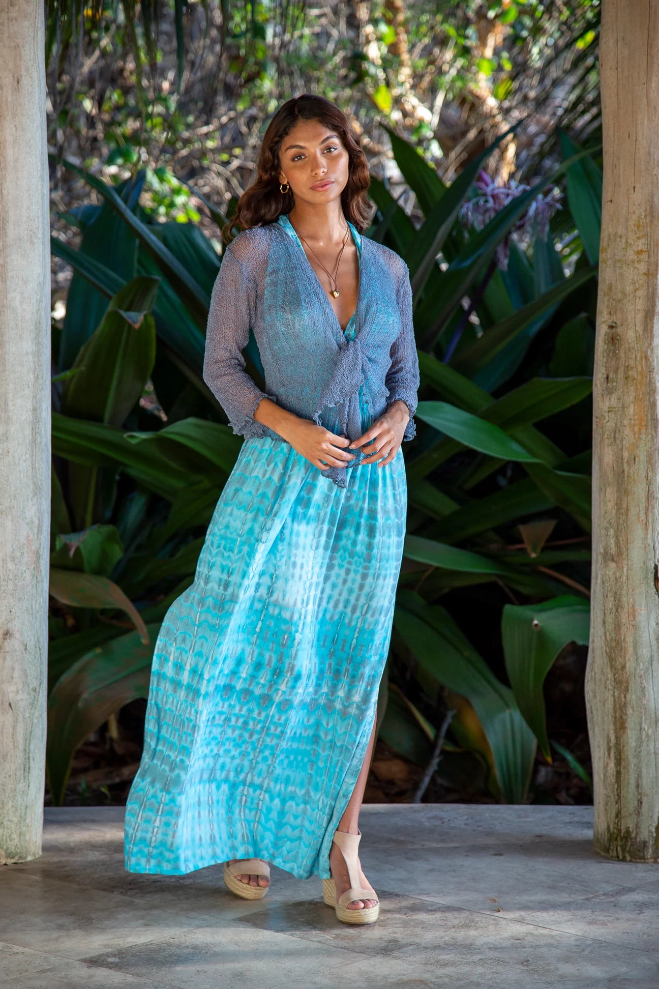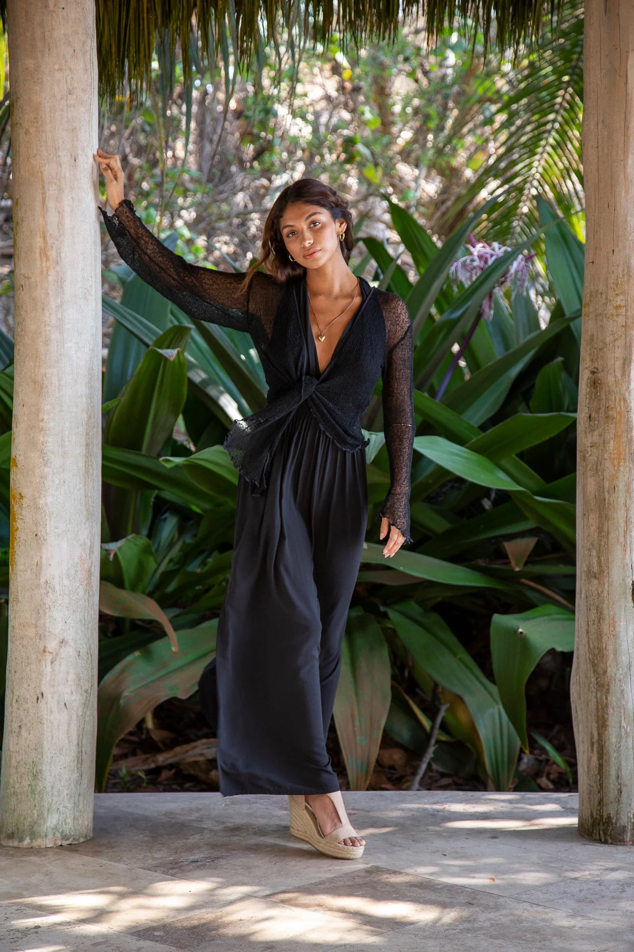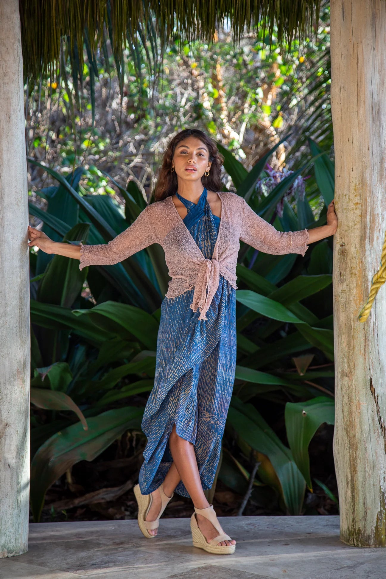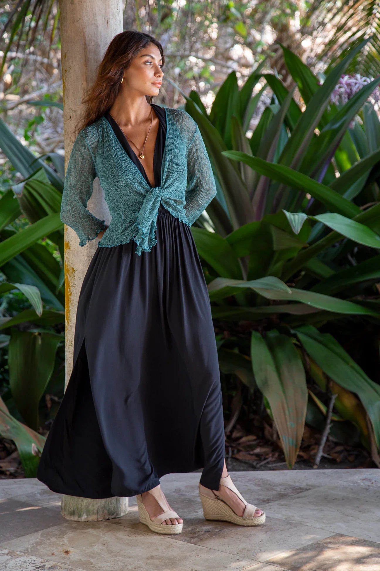 The Classic 3/4 sleeve Cardigan with a little feminine edge. Great for lightweight layering accessories, the one size fits most due to the knit's stretch factor of 1.5x. It's versatile and can be worn open, wrapped or tied in from or back to create a bolero look, covering your arms or chest or anywhere where you feel exposed and need a little extra coverage without completely hiding your outfit.