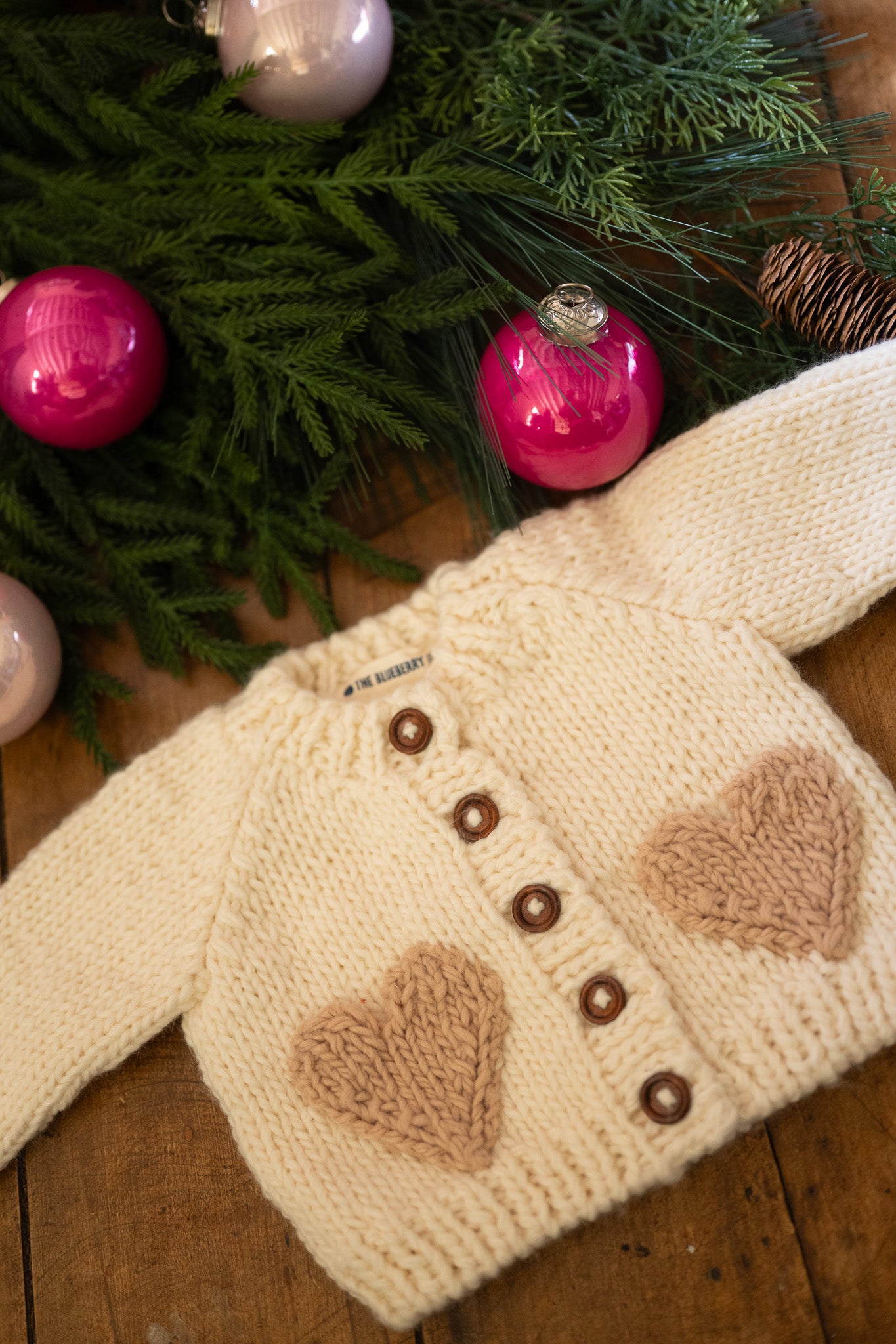 Your baby girl needs this chunky cream cardigan with heart pockets to collect all the love. Perfect for a Valentine's Day outfit or just every day sweetness.