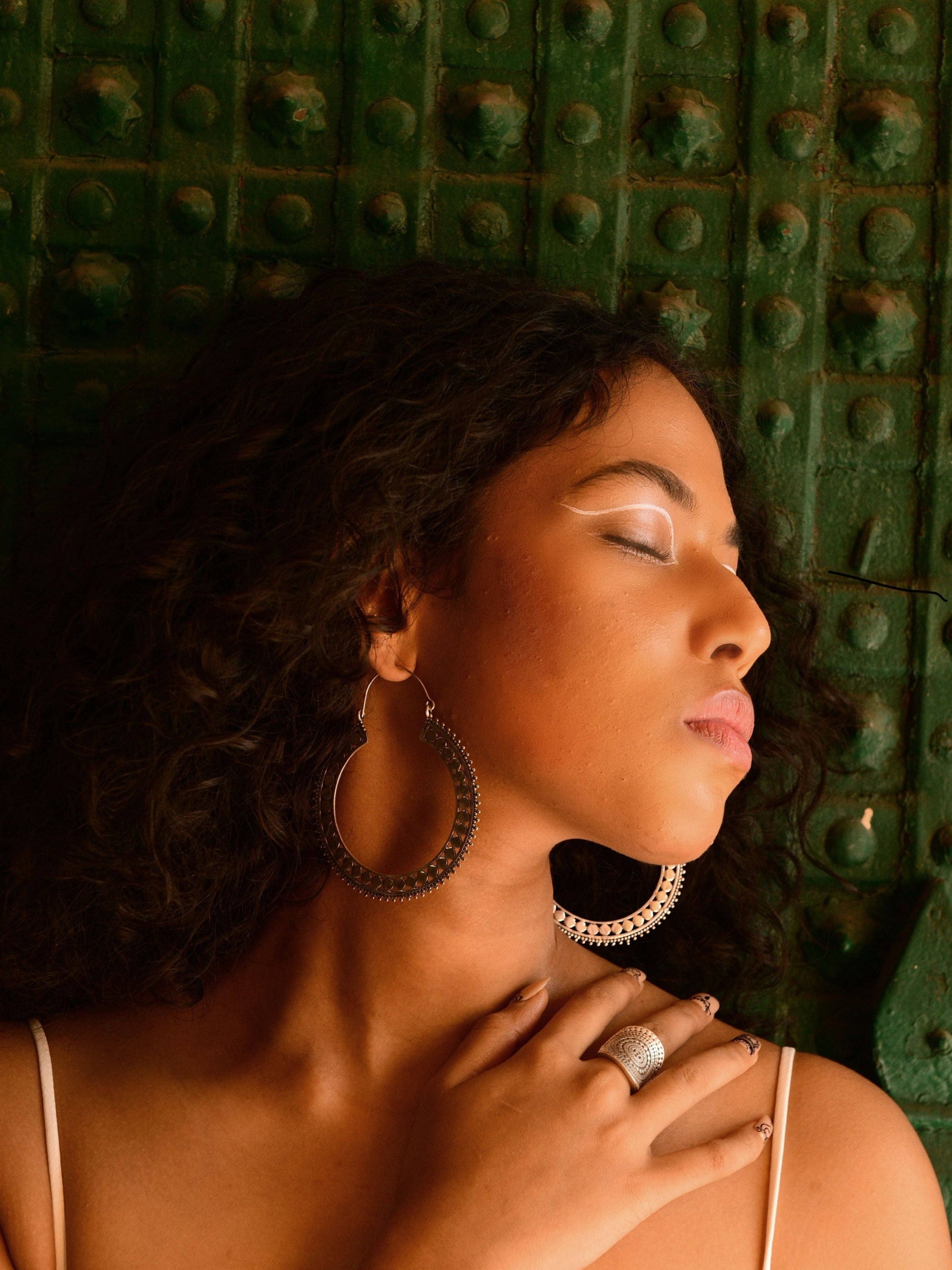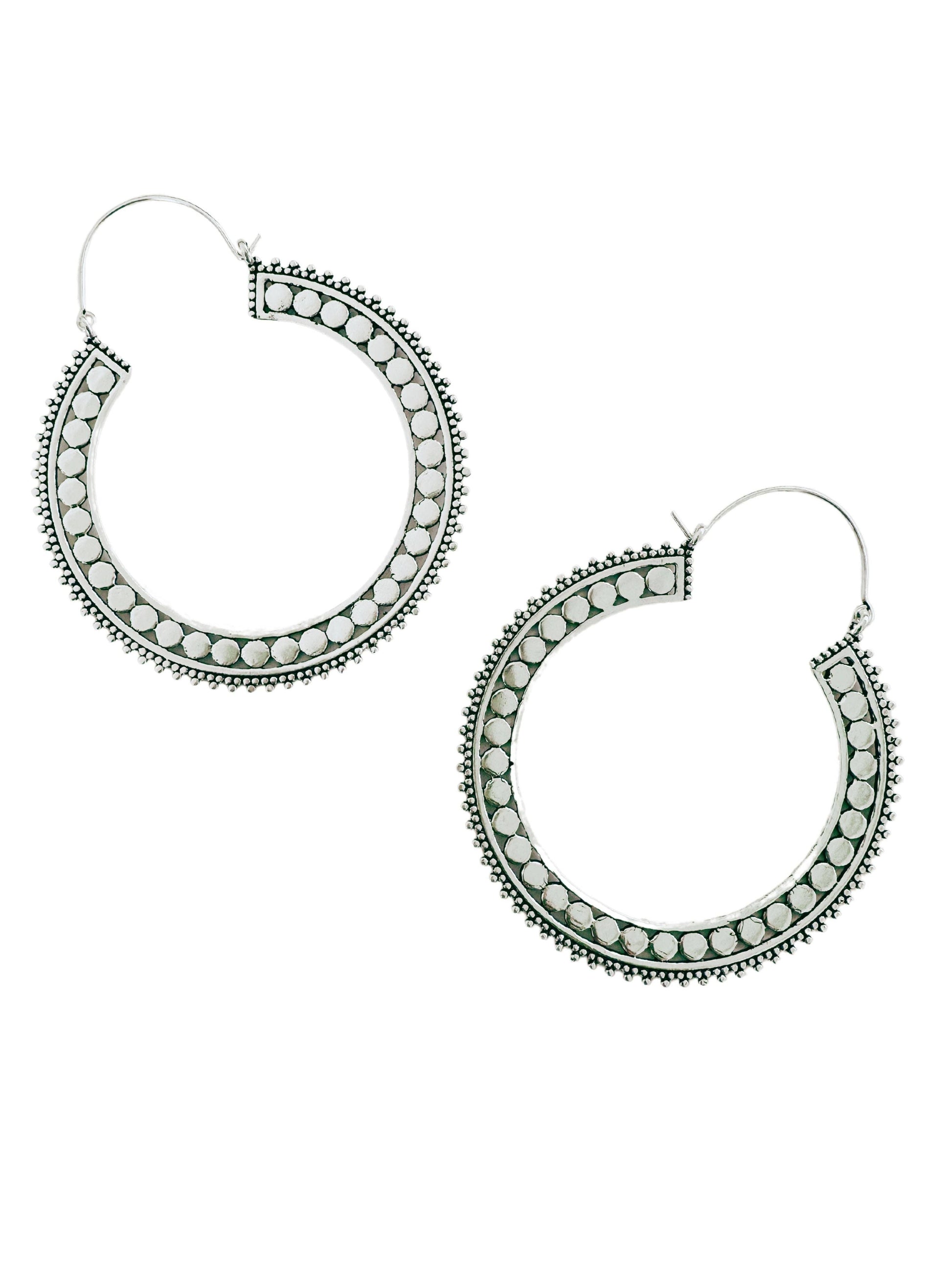 These Alina Silver Hoops are sure to make a statement with their eclectic and bold Indian designs. Crafted with elegant silver, these hoops will add a unique touch to any look.