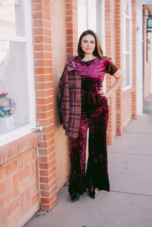 Indulge in luxury with the Bucko Velvet Ruffle Pants in Wine. Made with soft velvet fabric and adorned with elegant ruffles, these pants add a touch of sophistication to any outfit. Experience the comfort and style of these unique pants.