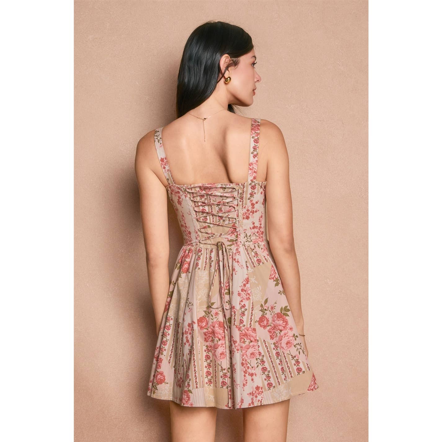 Embrace romantic elegance with this enchanting floral corset mini dress. Featuring a sweetheart neckline with delicate keyhole detail and adjustable shoulder straps, the fitted bodice showcases traditional lace-up corset closures for a flattering silhouette. The dipped waist transitions into a graceful fit-and-flare skirt, while a hidden side zipper ensures effortless wear. Crafted from soft 100% cotton poplin with a lined interior, this piece combines vintage-inspired charm with modern comfort. Perfect for special occasions or elevated everyday styling.