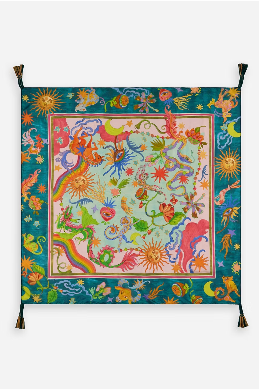 Crafted from luxurious 100% silk, the Kayla Silk Scarf is adorned with a vibrant pattern accented by a contrasting border. Thoughtfully designed to enhance any look, this square scarf is finished with tassels at each corner for added texture. Tie at the neck or at the handle of your favorite handbag for a pop of color.