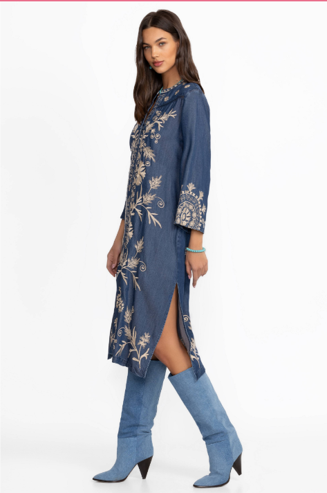 Crafted from a lightweight flowing fabric, the Western Trim Henley Dress is intricately embellished with floral embroidery and ladder lace trim. Featuring a distinctive western-style seamed yoke and a classic Henley neckline, this full-length dress is finished with bell sleeves, side slits and tassels at the hem. Pair with leather slides and bold silver jewelry for an eclectic look perfect for a relaxing casual day.