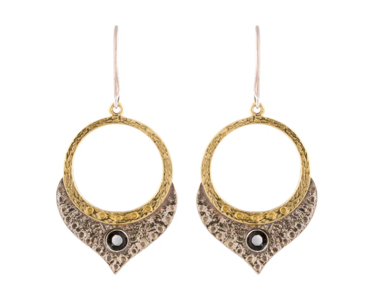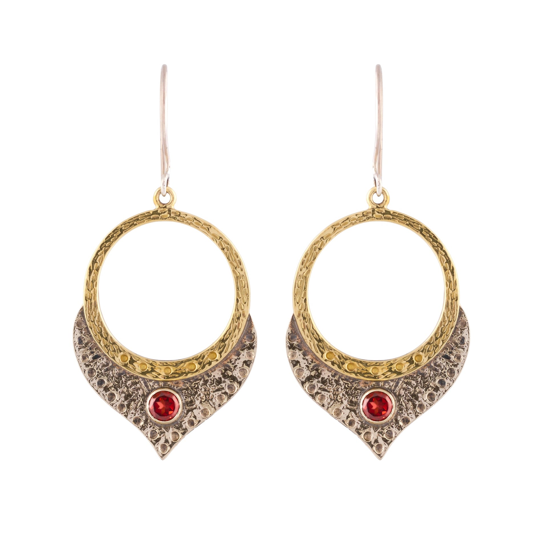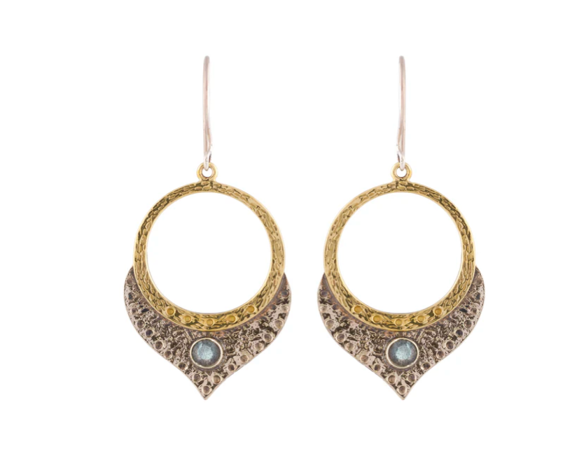 Elevate your style with the Ritual | Bali Hoop, featuring a sterling silver hook and a hammered silver and brass Bali-inspired design. Choose from a delicate drop of garnet, moonstone, or blue topaz to add a touch of natural elegance. Perfect for those who appreciate artisanal craftsmanship and subtle, meaningful adornment.