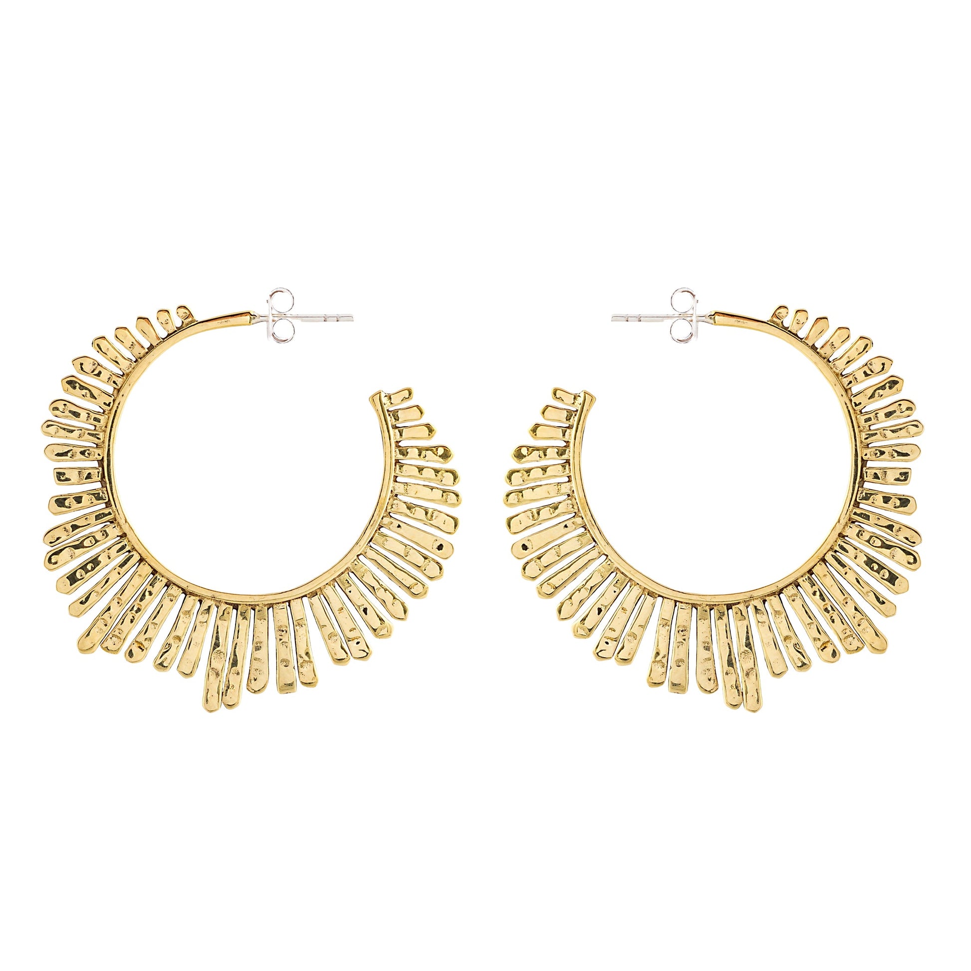 Elevate your style with the Ritual Sunburst Hoop, featuring a sterling silver post paired with a hammered brass or silver sunburst hoop. Measuring 2.75" in diameter, this elegant piece adds a radiant, artisanal touch to any outfit, perfect for those who appreciate unique, handcrafted jewelry.
